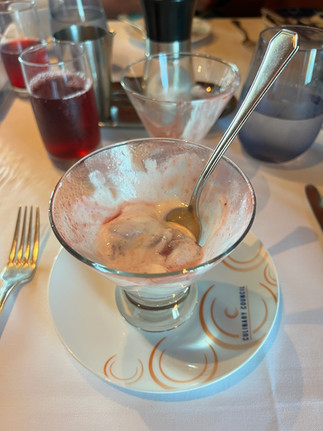For dinner, Bryan donned my pants (again) and we enjoyed a delicious private dinner in the main dining room! You won't be shocked to learn I enjoyed yet another cup of French onion soup! Bryan's pumpkin soup was awesome too and really brought about those fall flavors...even if we aren't feeling those fall temperatures yet!