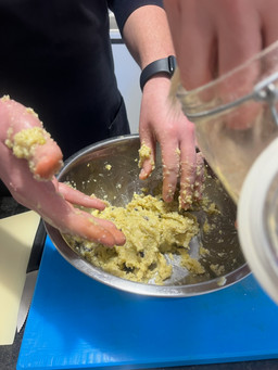 Then we moved on to polpette di broccolo, another classic appetizer made from steamed cauliflower (yea broccolo in Italian means cauliflower), pine nuts, currants, onion, and parmigiano reggiano. Bryan earned himself the role of dirtying his hands and forming our veggie-dough, while I helped roll the dough into balls! These bite-sized "meat-less balls" sound basic and bland but were packed with so much flavor! Michael explained that the Sicilian cauliflower is in season right now, so the punch of taste comes from the veggie!
