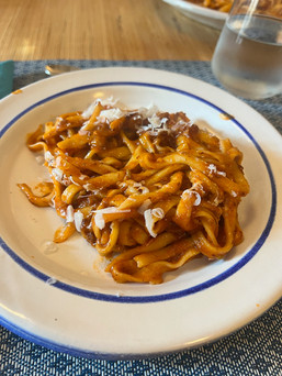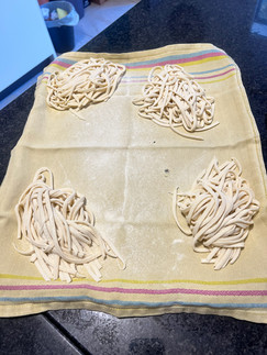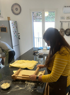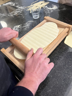 After prepping our dough, we used a chitarra to cut our dough into perfectly formed pasta noodles. The chitarra is a small machine that resembles a guitar that is popular in Southern Italy and Sicily. It's a classic pasta-forming machine that makes life a little easier!