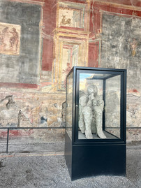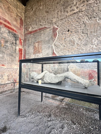 In this room, we also saw numerous casts of people and a dog who had perished in the city. Remember, most people were vaporized by the explosive heat, but some bodies were covered in hot ash and rock that fell from the sky. Once this ash settled and cooled, the bodies decayed, leaving behind an empty "cast" of their remains. During the excavations, when the archeologists would come across a large void, they would fill it with plaster to create a cast of the victim's body.