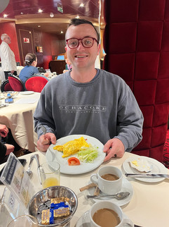 We had to be out of the room by 8 am, so we opted for one final formal breakfast in the dining room! With time to kill, we found a spot to sit and read/study some more before meeting up with RJ and Aidan to disembark and head to the airport!