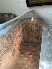 Around 1270, it was customary in Bruges to paint the inside of brick-lined graves. During the Middle Ages, the dead were often buried the same day they died, so the tomb painter had to work especially quickly as he freehand painted in the quick-drying lime. As a result, the drawings were quite rudimentary; they depict the virgin and child (at the foot of the grave), the crucified Christ (at the head,) and the side walls were adorned with angels holding incense burners to accompany the deceased's soul to heaven.