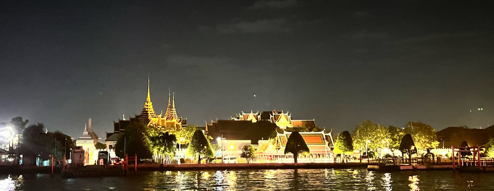 During our meal, we were “serenaded” by a lovely Thai woman attempting to sing American hit songs. Now I don’t want to say she was bad, because there may be an issue with the language barrier, but not only did she not know the lyrics to said American hits, but she was also not a very good singer. After eating, we hurried to the bow of the ship to enjoy the open air and some quiet space. We also wanted to get better pictures of the city and the temples we visited earlier in the day from the Chao Phraya River!