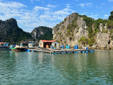 We visited the Vung Vieng Fishing Village, which used to be an active fishing village until 2014, when the United States, with the help of other NGOs, helped relocate the families living here to the mainland for health, safety, and better education for the children. Many of the families still return to their floating homes during the day as a social hub for the community and as a meeting spot between fishing trips.