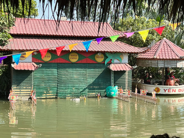 We boarded small boats that were rowed by prior fishing villagers. As they took us through the village, we were able to see tons of floating shacks with platform "yards" for their dogs to explore. We were told the dogs are dropped off in the morning to guard the fishermen's homes while their owners are out at sea earning a living.