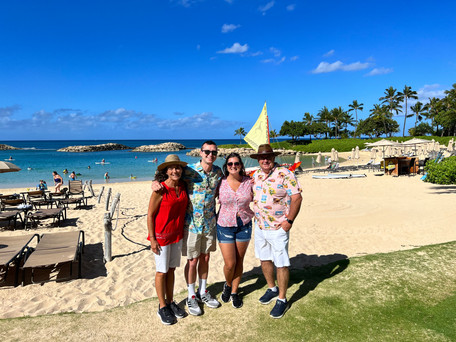 The day Jennifer and Kevin were most excited for: today was the day we visited Aulani for a character breakfast! Aulani is Disney's only resort in Hawaii and it's where Bryan and I stayed in March of 2020 when our spring break trip was canceled at the last minute due to that two-week global shutdown for COVID. (If you didn't chuckle at that last part, then you don't see the irony. Japan is still closed to tourists and that shutdown happened over two years ago.) I mean, look at this photo of Bryan from that first trip:
