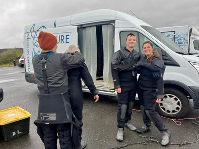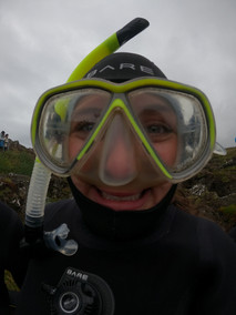 So as we donned drysuits for the first time in our lives, Bryan and I got a quick little geology lesson about the area and realized how hefty dry suits are. Since we aren't dry suit certified for diving, our only option was to snorkel. At first, I was a little disappointed, but after dressing in the thermal layer suit, then the dry suit, then the (not waterproof) gloves, hood, and flippers, I realized how much heavier this gear is than normal dive equipment. The final step before entering the water was adding a neck strap around the neck seal to *attempt* to keep water from leaking into our dry suit. This neck strap was a piece of rubber that was tightened around our necks and really did feel like a noose...but all in the name of staying dry in the 35-degree waters!