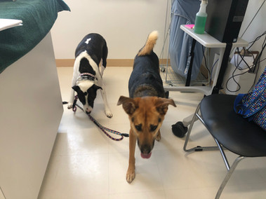 The vet visit went great! Hugo and Reynolds were so happy to meet friendly faces. Of course Reynolds decided to carry on a conversation with the vet tech as she checked us out at the end of our visit, but I would expect nothing less from my vocal girl. Since the pups have a month left of quarantine, we were told to stay on base and away from other dogs until our next vet visit on July 26.