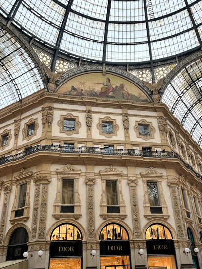 Our second major stop of the tour was the Galleria Vittorio Emanuel II, the largest shopping arcade in Italy. This four-story shopping gallery was built in 1877 and is home to the flagship locations of Armani, Gucci, Prada, and Louis Vuitton. Katie couldn't care any less about the shopping options, but she did take notice of the four mosaics at the center of the shopping area- one representing each of the four main "areas of influence:" Europe, the Americas, Africa, and Asia!