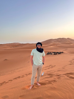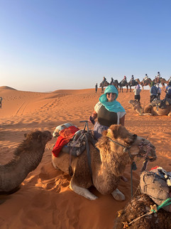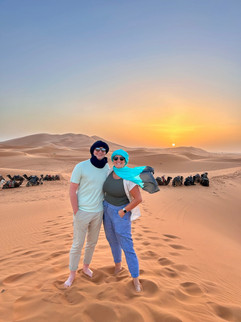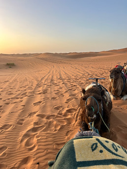 Getting up on the camels was more thrilling than I imagined! When the camels go to stand up, the rider goes almost horizontal while holding on tightly to the harness. I wasn't expecting the uncomfortable saddles, but the views were well worth it! Halfway through the ride, the camels had a break and we climbed a nearby dune to watch the sun set. Sitting on a dune while the sun set was spectacular and a memory we will not soon forget!