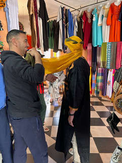Right along the edge of the Sahara desert, we stopped to buy the traditional headwraps needed for our time in the desert. Bryan and I opted for the longer fabric wrap that consisted of the "tagelmust" (headwrap) and the "litham" (nose and mouth covering.) With the sun beating down on us and the sand blowing across the dunes, our guide was quick to point out that this wasn't just a "touristy" photo op, but a true local necessity.