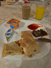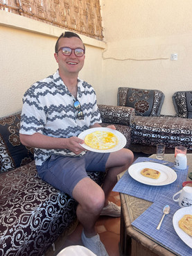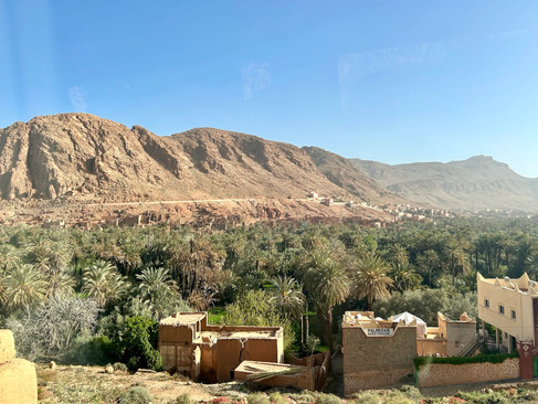 As the sun rose over the city of Tinghir, we woke eager to hit the road and make the final leg of the journey to the Sahara Desert! In the daylight, our hotel seemed better than last night, but we weren't complaining with our mid-morning checkout after enjoying a traditional Moroccan breakfast of bread, jams, hard-boiled eggs, and coffee.