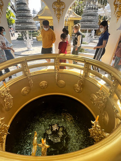 As we walked up to the temple, we first had to cross a bridge over suffering hands extending out of the ground. This creepy image reminded me of Dante's Inferno with detailed descriptions of the levels of hell's suffering. As we entered this strikingly stunning temple, we first noticed the giant Buddha at the center with a common area for people to kneel and pray.