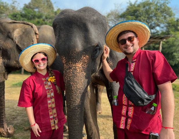 Around 8 am, we arrived at the Elephant Rescue Park, where we changed into traditional Thai outfits and listened as Andy explained how this elephant sanctuary came to be. In 2015, the park was started when the "Elephant Dad" bought his first elephant for roughly $30,000 USD. This female was badly wounded from a nasty, deep cut on her front left foot that went untreated for years, while she was forced to continue to give rides to tourists. This infected foot left her unable to walk and she was soon considered "no good" to the current owner. Upon her arrival to the park, the Elephant Dad saved up funds to have this elephant transported to an elephant hospital, where she died 6 days post-surgery. While the park's first elephant didn't survive her injuries, her body was brought back to the park and buried "at home." Andy explained that this story is told to every park visitor to show the brutality of Thai elephant riding parks and the need for protective laws.
