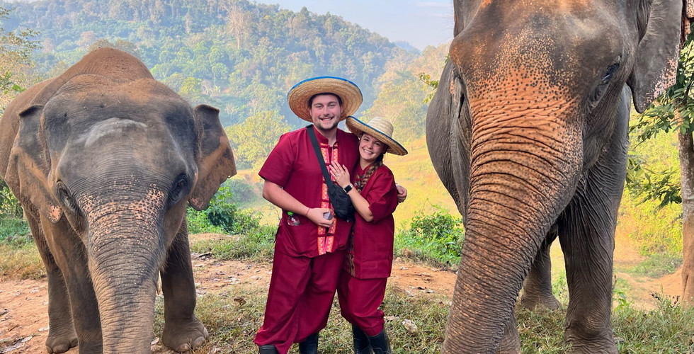 With the elephants guiding us, we had no choice but to pause for another snack along this beautiful ridge. While Saba and Mopo snacked on some low-lying vegetation, Ryan worked up his nerve and asked the biggest question of his life. Ryan proposed to Cady on this scenic hill, overlooking the lush Thai mountainside, with Saba and Mopo behind them! It was the most beautiful proposal, and left Andy in tears!
