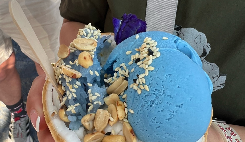 Before leaving the Blue Temple, John took us for ice cream. Now, Ryan Kimble has been looking forward to this ice cream treat since it was first mentioned this morning. We watched as this boy deflated and nearly cried when he saw that the blue coconut ice cream was the only option. Bless his heart, we really have been traveling with an oversized toddler, and he was not having it! Thankfully, there were some of the Chiang Mai mini pineapples at a nearby booth, so Bryan treated Ryan to a shared bag of fresh fruit!