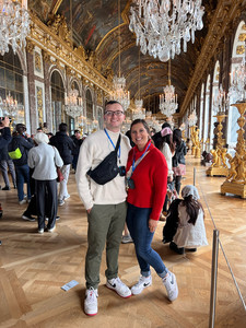 After navigating our way to the westernmost side of the palace, we were greeted by this landmark's most picturesque room: the Hall of Mirrors. The Hall of Mirrors is 240 ft in length, decked out with 357 mirrors, 43 chandeliers, and a barrel-vaulted ceiling with stunning paintings, and it made us feel like we were in a Bridgerton episode.