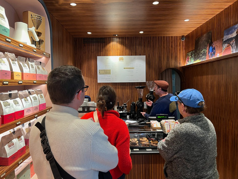 After the 40-minute car ride back into town, we decided it was time for an afternoon pick-me-up before our two-hour wine tasting. We walked up the block from the wine store and ran across Terres de Cafe where Katie and I enjoyed our standard double espresso, Mom got a hot chocolate, and Dad got his regular, cappuccino.