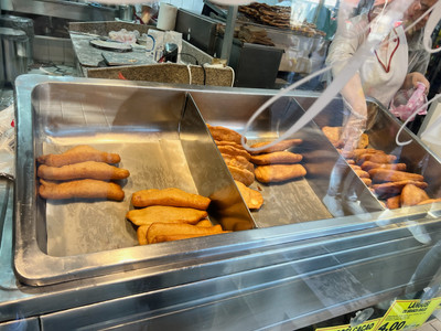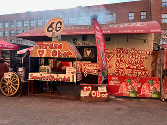 My favorite treat of the entire food tour was at Terasa Obor, which had a line wrapping around the block! While our guide hooked us up with food, we scoured the area for an empty picnic table! Mihaela brought us a tray of beers and mici (pronounced 'meech') sausages from the long-lined booth! Those sausages were *chef's kiss! * We also enjoyed some grapes and cheese from the farmer's market.