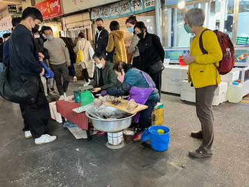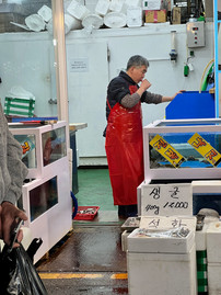 We noticed a long line forming around an elderly lady, as she cut up sundae and stuffed it into plastic bags for people to take on the go. Once I saw her wipe the sweat off of her head and continue to cut the sausage, and witnessing a man brush his teeth over a fish tank at a nearby stall we decided to pass...we aren't in America anymore! (And clearly, there isn't an FDA in Korea!)