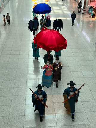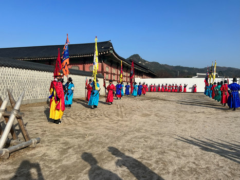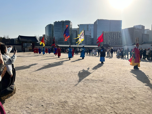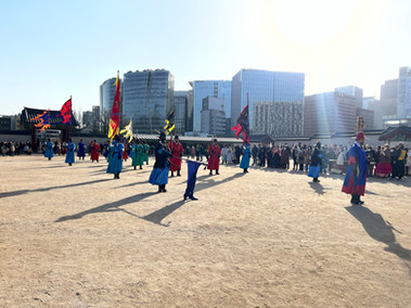 After my second wake up around 8:00 am, we ran over to the nearest bus station to make it to Gyeongbukgung Palace to view the Water Gate Open Training and the Changing of the Guard Ceremony at 9:35 and 10:00 am, respectively. Gyeongbukgung Palace is widely considered the grandest of all the palaces in South Korea; the original palace was built in 1395 and was the main royal palace of the Joseon Dynasty. The Joseon Dynasty was the last dynastic kingdom of Korea and lasted over 500 years until the Empire of Japan conquered Korea in 1910; this palace served as the home of the kings of the dynasty and also housed the central government of Joseon.