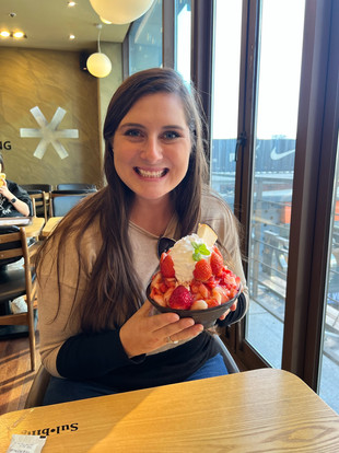 After our new book purchase, we made our way to Sulbing to try out a Korean dessert known as bingsu. Bingsu is a milk ice sorbet topped with all sorts of things. To better understand, Katie's bingsu was essentially made of snow cone ice with sweetened condensed milk covered with strawberries, cheesecake, and whipped cream; my bingsu was tiramisu flavored. Most of the Koreans in the store were ordering one bingsu to share amongst three of four people, while us fatties were ordering one for each of us. (To our defense, we honestly had no idea they were going to be the size of our heads!) We definitely didn't finish them, but we made a pretty hefty dent into it!