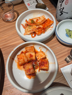 We did recognize one thing: kimchi, fermented cabbage. Katie and I have both tried kimchi during our adventures in Asia and neither of us really enjoyed the taste or smell very much. I wasn't going to dabble with it again, but Katie suffered through a few bites because she didn't want to offend the waitstaff. Better her than me. Based on her facial expression, this Korean superfood wasn't better on her tastebuds than the other times she's tried it.