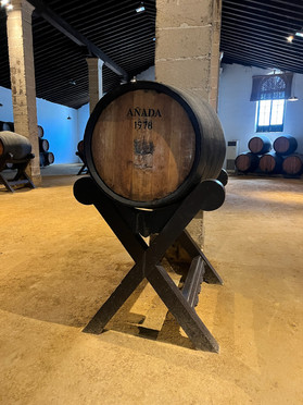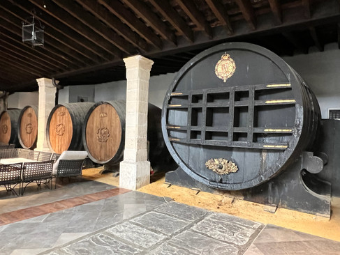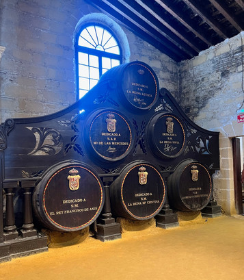 In one of the warehouses, we were greeted by a large black barrel in the middle of a wall with six barrels on each side of it. We learned that Queen Isabella II visited Tio Pepe in the mid-1800s, and to honor the queen, the company created the large barrel in the middle called Cristo, and the twelve barrels surrounding it were called el Apóstoles. Each of the 12 barrels has the Spanish name of a disciple decorating the outside. Even though these barrels were made almost 200 years ago, they still use them to age their 30-year sherry!