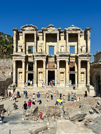 Arguably the most beautiful, and Katie's favorite part of the tour: the Library of Celsus! This beautiful library was built in the second century AD and was home to over 12,000 scrolls during its heyday. This structure was rebuilt using 60% original pieces and was a true show-stopper building facade in Ephesus!