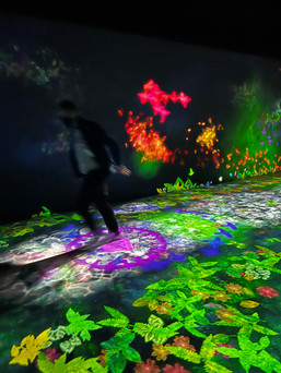 Many of the rooms were covered in different flower projections, and one memorable room was covered in butterflies. As you touched the butterflies, they fell to the ground and became fallen leaves. After reading the plaque on the wall, we learned that these butterflies can escape the room and flutter around the entire museum, but once they are touched, they fall to the ground and have to be reborn in the butterfly room.