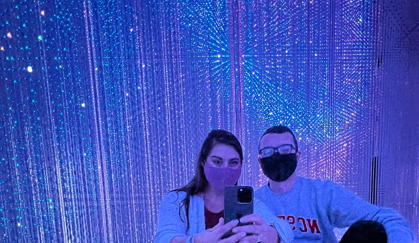 As we exited the water area, we entered a room with glass walls and flooring. We were told, through hand motions, to lay down and look at the ceiling, where we watched as the roof came to life. We watched as different flowers moved and collided as if in a kaleidoscope. After a few minutes of watching, Bryan sat up nauseous and was ready to move on. I knew if I laid still much longer I would fall asleep to the peaceful, subtle music playing in the background!