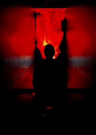 As we went around the next corner, we entered this dark hallway with a bench sitting only inches out of the water. Here, you could sit and watch the fire display as it's reflection danced along the water's surface. We noticed the water in this area was significantly warmer than the main area with the koi fish, giving heat to the image!