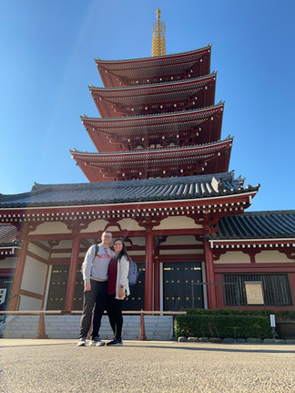 While we were in Northern Toyko, we also swung by and visited Sensō-ji Temple, the city's oldest and most popular Buddhist Temple. While this temple was built in 624 AD, you wouldn't know it with the busy street life surrounding it! As we made our way towards the temple, we first reached the Kaminarimon Gate, where we could see two statues behind glass, one the Shinto god of Thunder and the other the Shinto god of Wind. In the archway of the gate was a giant lantern, that you pass under to enter the Temple area. This lantern, a chōchin, is almost 13 feet tall and weighs nearly 1,500 pounds! On the front of the lantern is the name of the gate in the Japanese characters, 雷門.