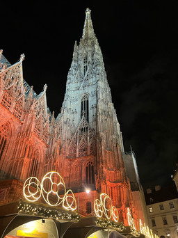 Our final market for the day was Stephansplatz Christmas market, held outside of St. Stephen's Cathedral, which is one of the tallest churches in the world with a tower height of 448 ft. As we enjoyed our mulled wine (in our third different mug of the evening), we marveled at the lights while fighting the crowds in the shadow of this grand church.