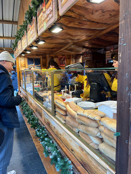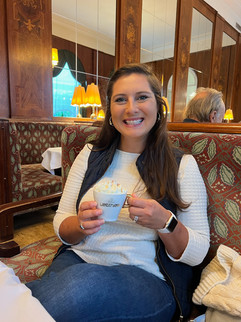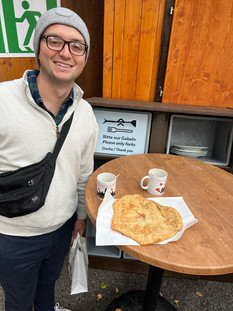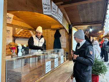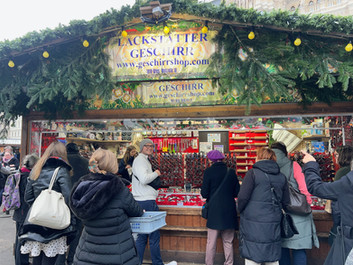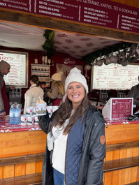 One thing we were informed of before traveling was that each individual Christmas market in Europe sells mulled wine in a themed mug with the market's name on it, so of course Katie and I had to grab a few drinks to check it out! After waiting in line to grab a Langos (Hungarian fried bread covered in butter and garlic) and two mulled wines, we found a table to enjoy our snack and marvel at our new cups!